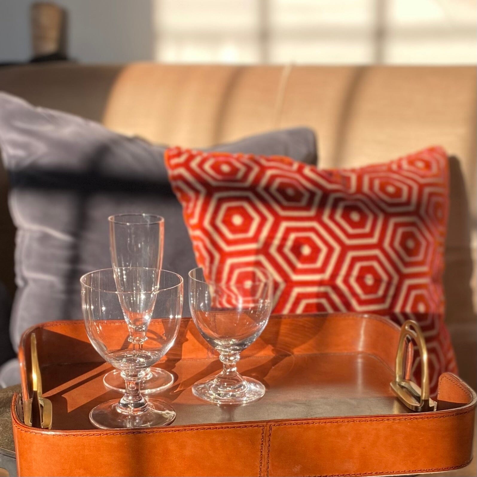 A useful tray in hand dyed chestnut brown leather with gold stirrups as handles. Perfect for holding crystal decanters on top of your bar or for serving after dinner drinks.