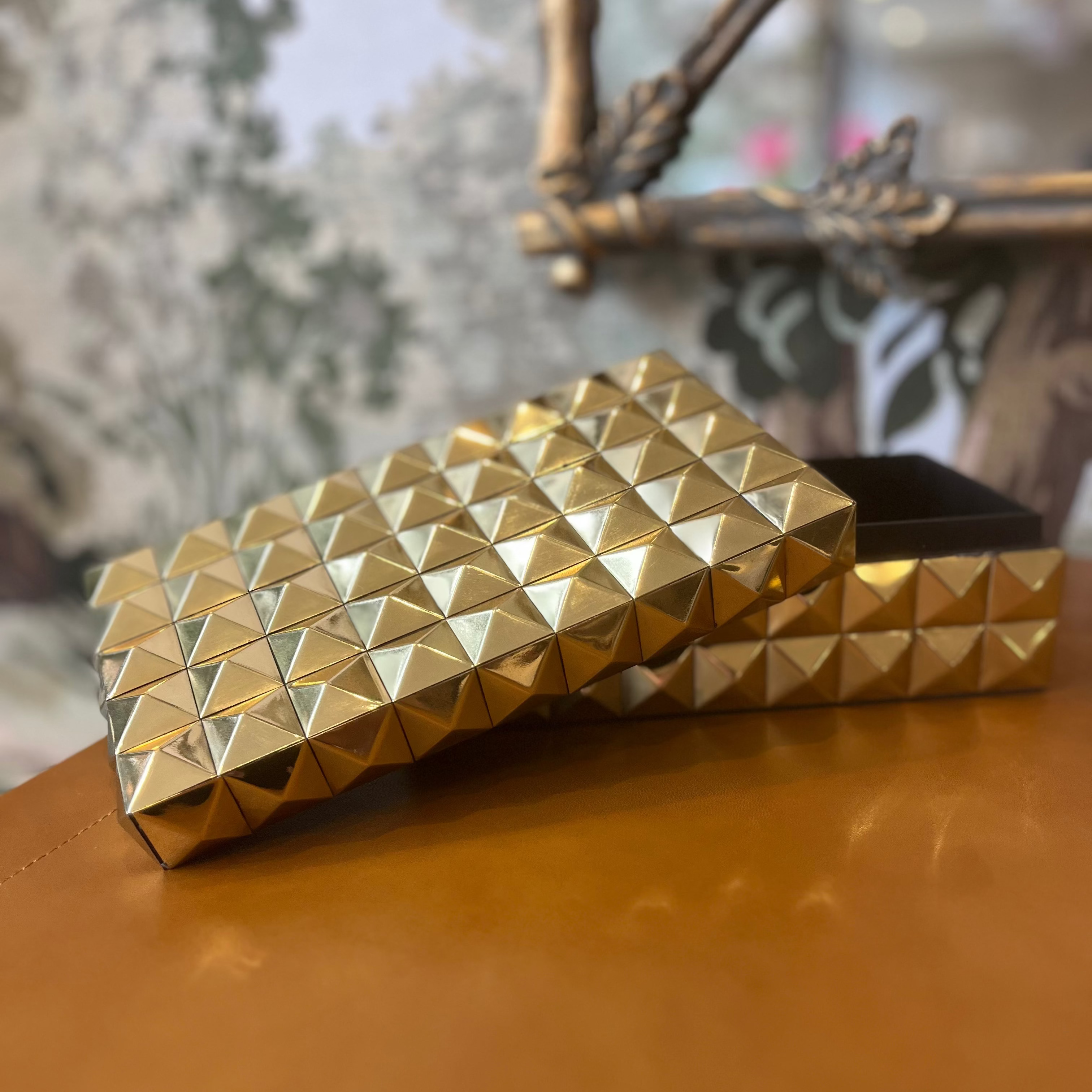 The Wall Street Box is a stunning decorative storage piece featuring an intricate 3D geometric gold metal relief. This luxurious box showcases a mesmerising pattern of raised pyramidal studs that create a captivating play of light and shadow across its metallic surface.